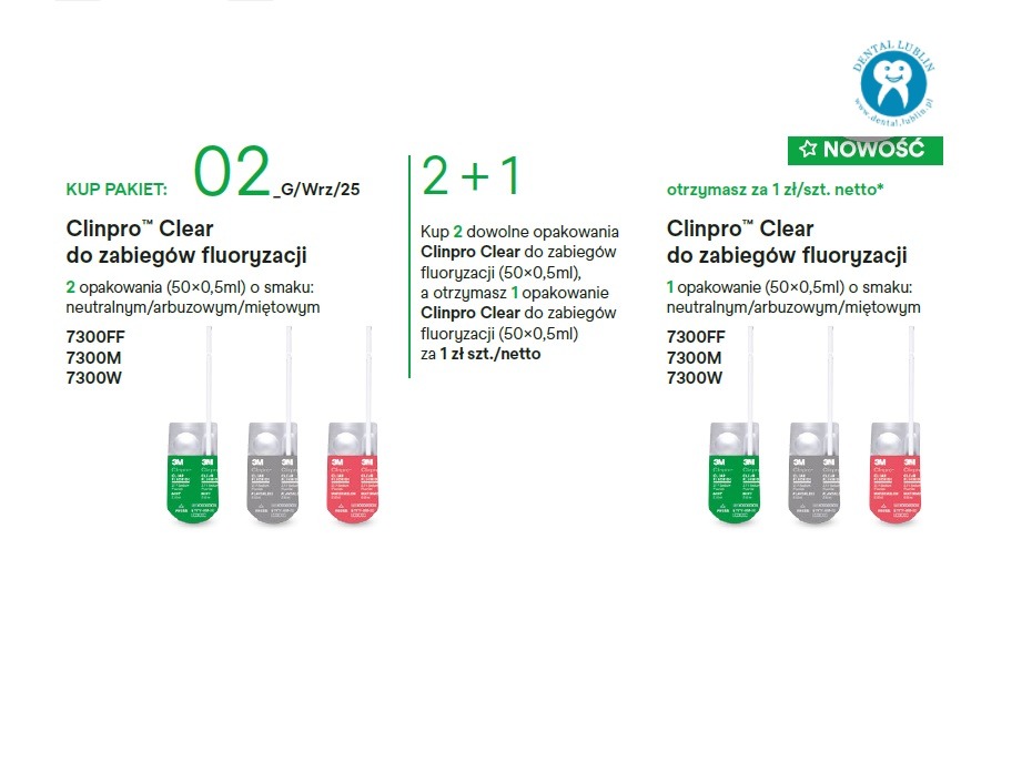 Przy zakupie dwóch opakowań lakieru Clinpro Clear op.50szt Gratis trzecie opakowanie za 1zł netto dosyłany z biura Solventum Dental.